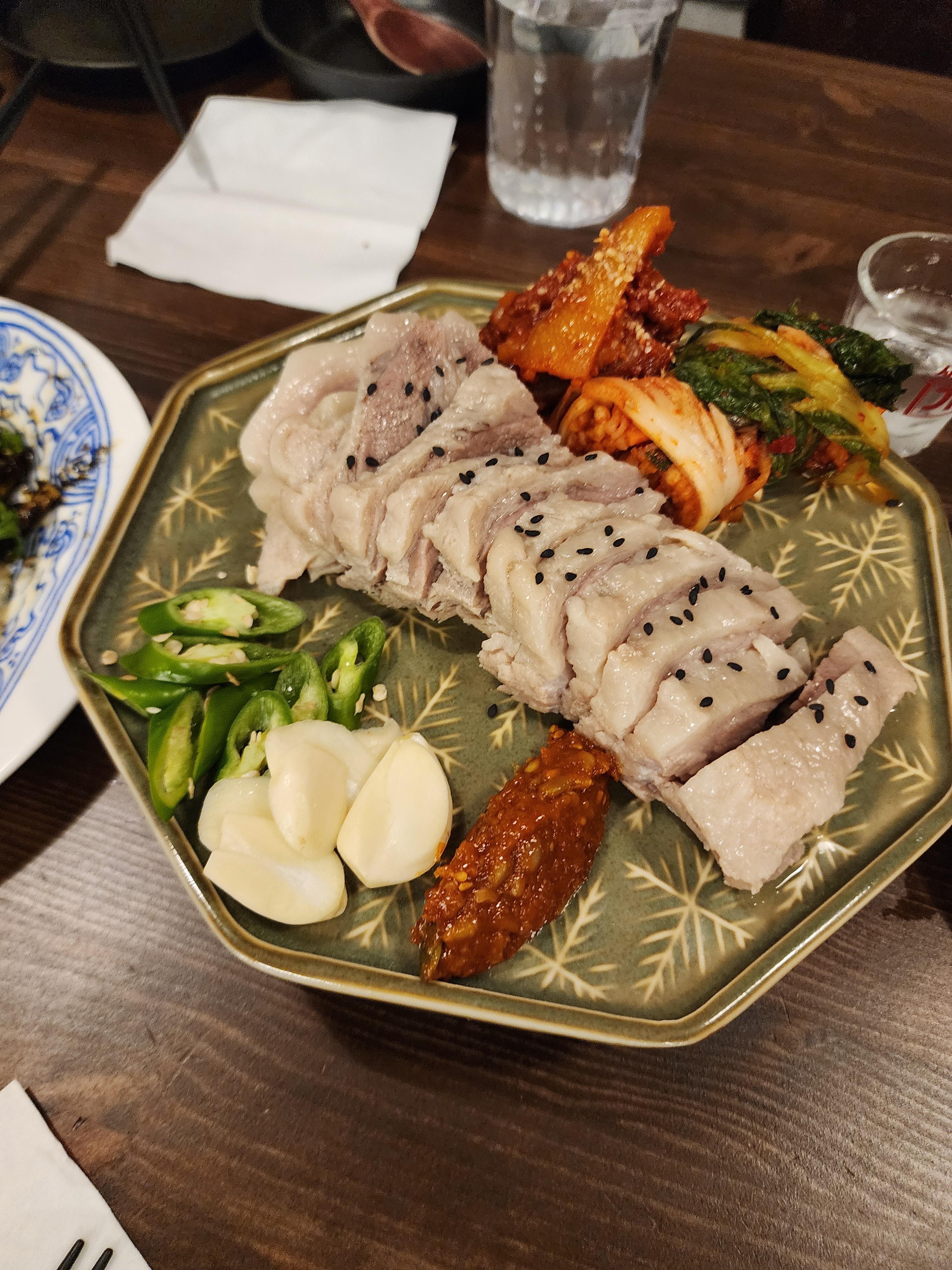 흰백색의 야들야들한것과 김치와 한접시가 알차게 잘 어우러집니다.
