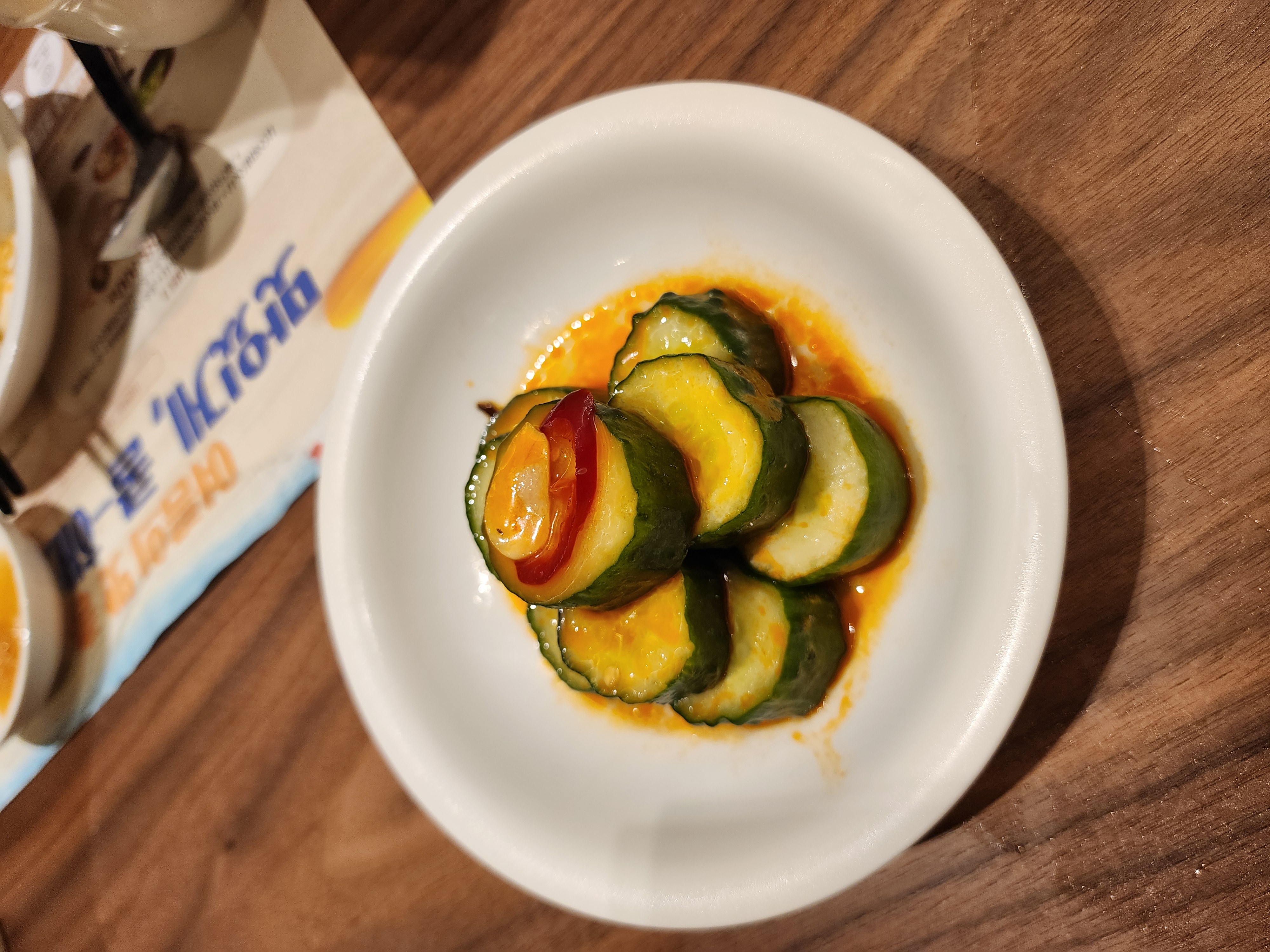 함께 주문한 라웨이황과(매콤한 오이절임)도 인상적이었습니다. 아삭아삭한 오이에 매콤한 양념이 어우러져 입맛을 깔끔하게 잡아주는데, 기름진 샤오롱바오와 곁들여 먹으니 훨씬 조화로웠습니다. 단순한 사이드 메뉴 같지만, 은근히 계속 손이 가는 맛이라 추천할 만합니다.