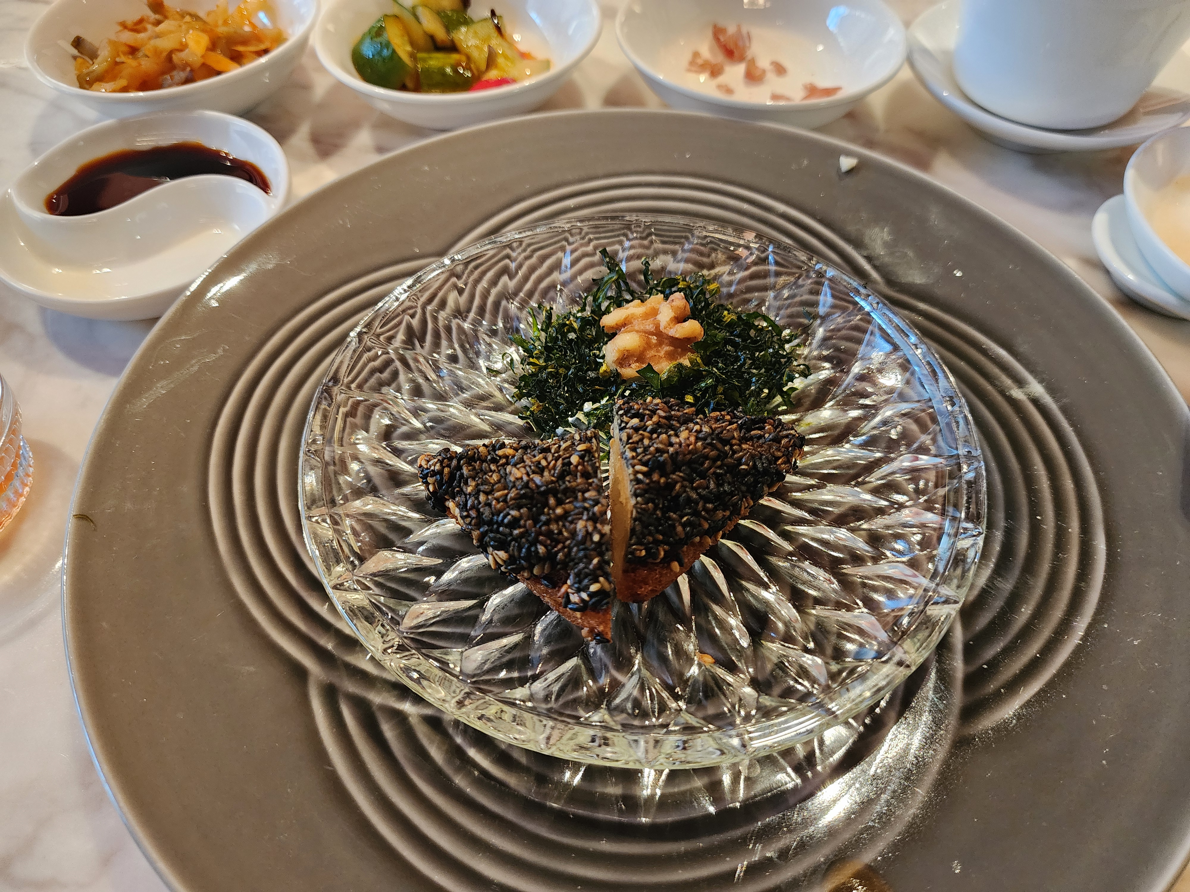 참개를 곁들인 멘보샤와 위에는 김과 호두