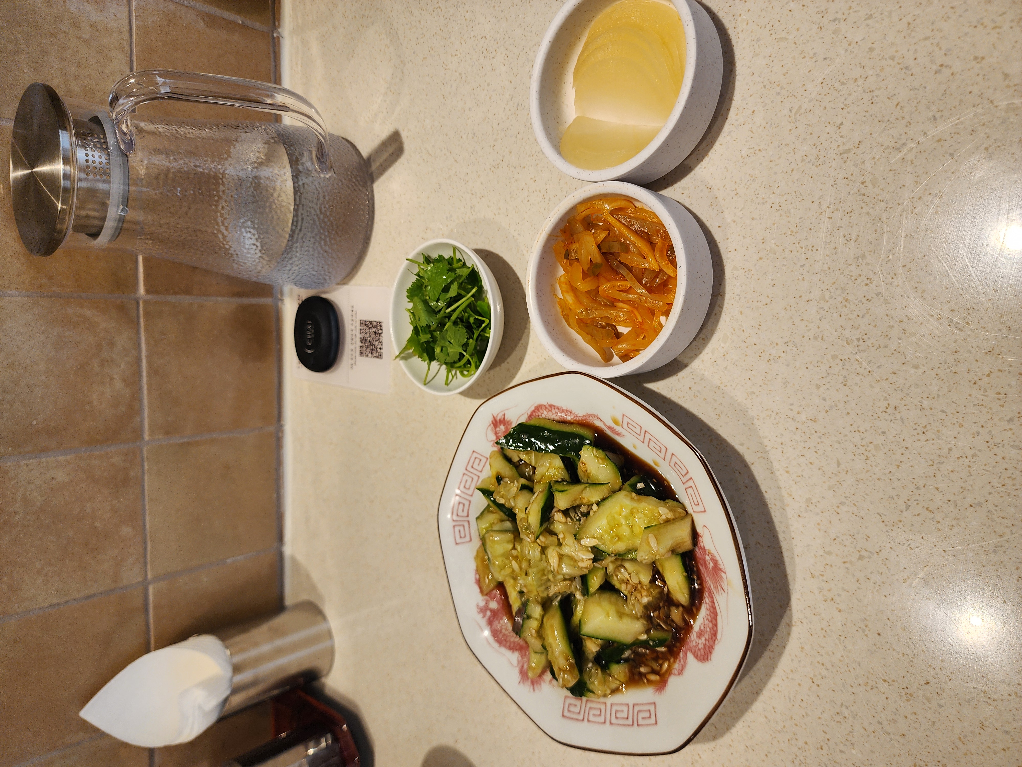 기본찬인 짜샤이와 단무지, 그리고 저는 오이무침 주문!