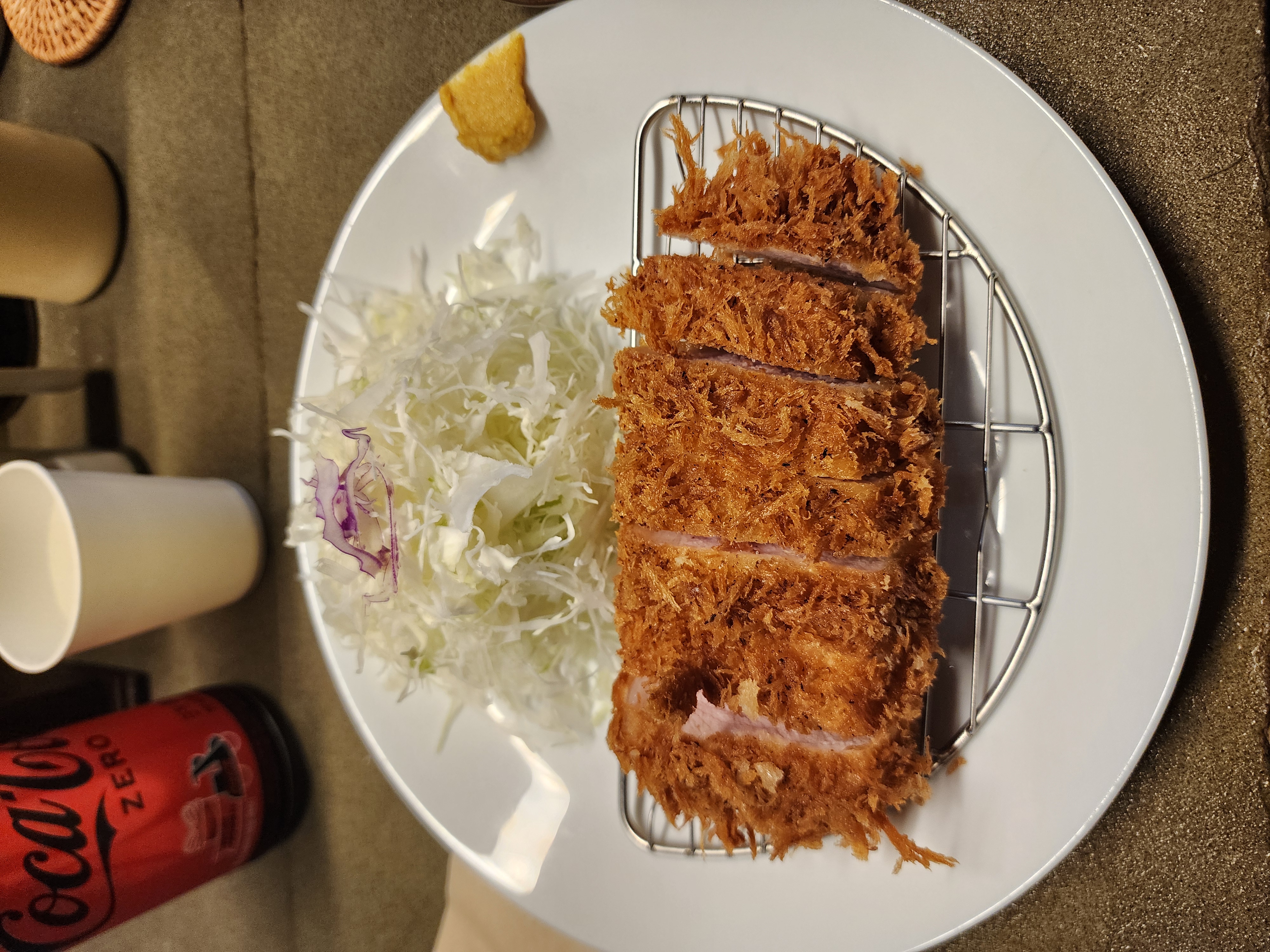 양배추와 겨자, 돈까스가 제공되고 샐러드소스와 돈까스 소금이 있습니다.
