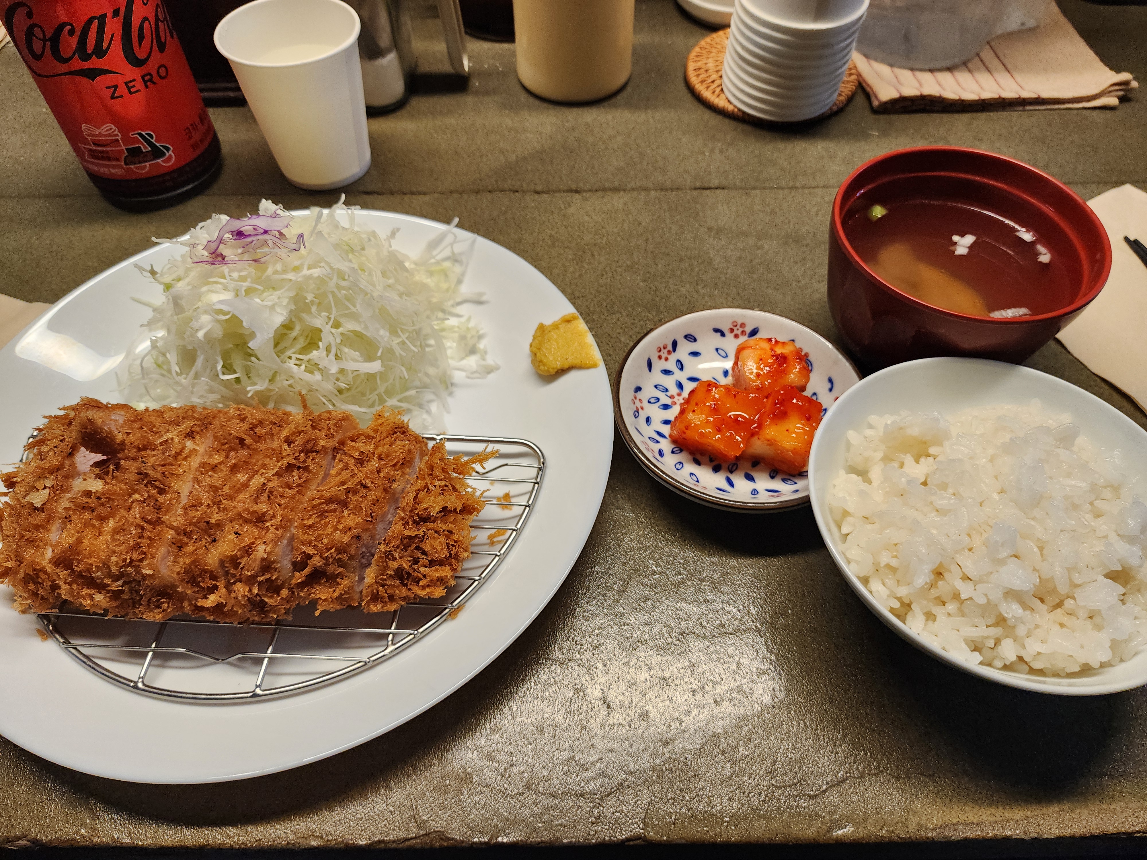 밥과 김치, 그리고 장국이 나오는데 돈까스는 밥도 아주 중요합니다.