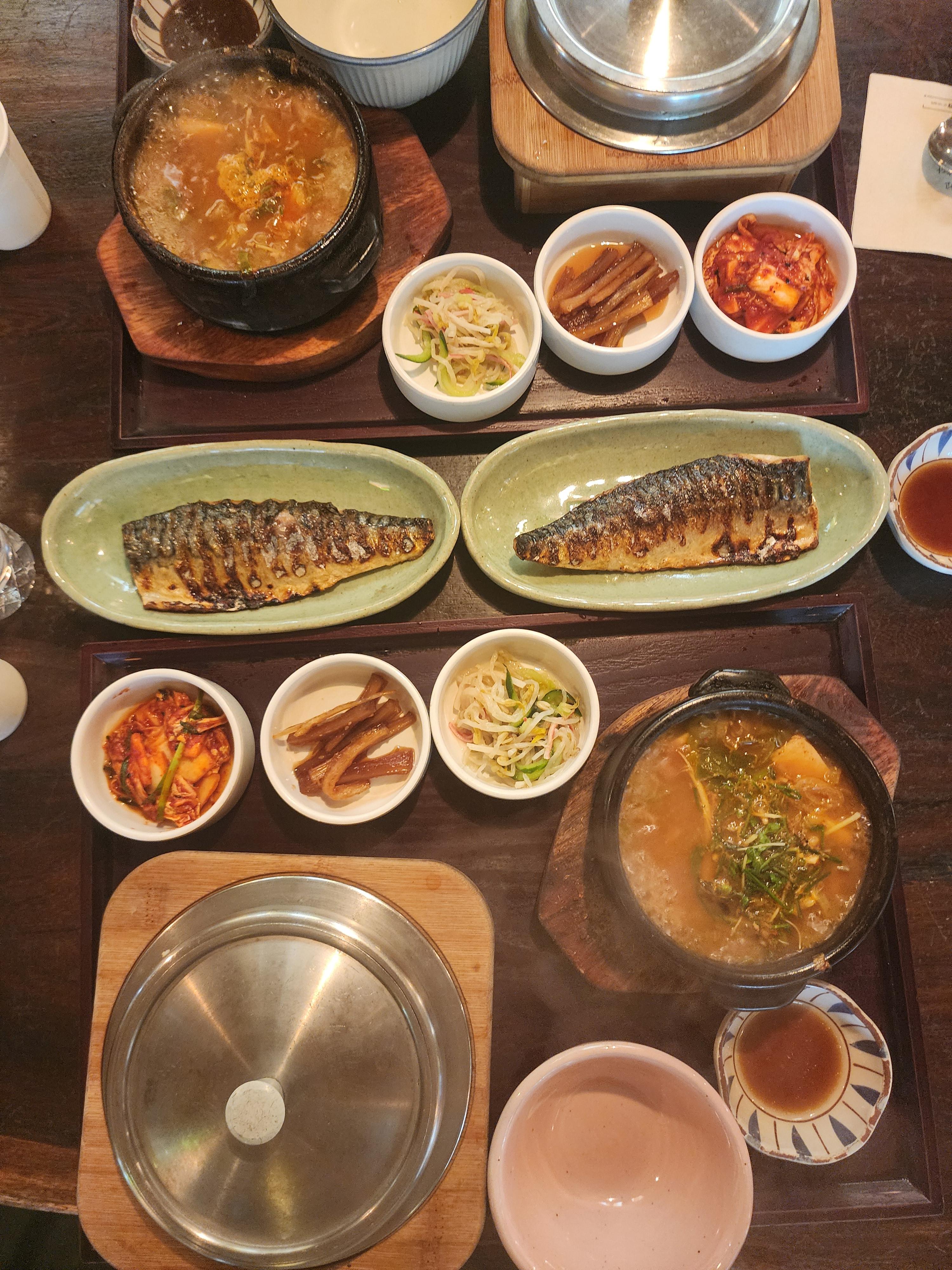도마 안국접은 솥밥과 찌개, 그리고 생선이나 고기가 함께 있습니다.